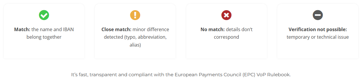 Verification of Payee (VoP) is a real-time verification service that confirms whether a provided name or company identifier matches the actual bank account holder of a given IBAN. By validating beneficiary identity before payment execution, VoP helps prevent fraud, reduce payment errors, and build trust in financial transactions.
